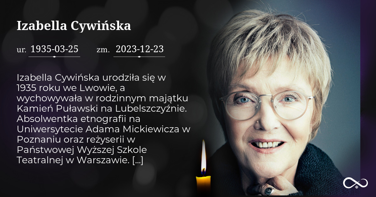 Izabella Cywińska urodziła się w 1935 roku we Lwowie, a wychowywała w rodzinnym majątku Kamień Puławski na Lubelszczyźnie. Absolwentka etnografii na Uniwersytecie Adama Mickiewicza w Poznaniu oraz reżyserii w Państwowej Wyższej Szkole Teatralnej w Warszawie. Po latach wspominała, że to do PWST dostała się za trzecim podejściem. „Po pierwszej porażce załamałam się, płakałam dwa dni i płakałabym pewnie dalej, gdyby nie Olga Lipińska, która była już absolwentką i namówiła mnie, żebym nie rezygnowała” – wspominała Izabella Cywińska. Kilkanaście lat szefowała wielkopolskim teatrom: najpierw (1970-73) była dyrektorką Teatru im. Bogusławskiego w Kaliszu, a następnie (1973-1989) Teatru Nowego w Poznaniu. Izabella Cywińska była pierwszą osobą na stanowisku ministra kultury po utracie władzy przez PZPR. Premier Tadeusz Mazowiecki powołał ją 12 września 1989 r., pełniła je do 12 stycznia 1991 r. Reżyserowała nie tylko sztuki teatralne, ale i w Teatrze Telewizji, a także m.in. serial „Boża podszewka”. W latach 2008-2011 była dyrektorką Teatru Ateneum w Warszawie. Izabella Cywińska została odznaczona Krzyżem Kawalerskim Orderu Odrodzenia Polski (1989), Złotym Medalem „Zasłużony Kulturze Gloria Artis” (2005), Krzyżem Oficerskim Orderu „Za zasługi dla Litwy” (2006) oraz Krzyżem Oficerskim Orderu Odrodzenia Polski (2011). W 2013 roku otrzymała tytuł honorowego obywatela Poznania. Izabela Cywińska zmarła 23 grudnia 2023 r., miała 88 lat. „Odeszła Wielka Dama polskiego teatru (…) Rozmawialiśmy telefonicznie w ten wtorek, jak co tydzień: o teatrze i o polityce, i trochę o nadchodzących świętach. O zdrowiu – broń boże, to od roku był temat zakazany. – Jak Mama się czuje? – miałem zaszczyt tak panią Izę nazywać. – Szkoda czasu, synku. Boli jak zaraza, więc nie ma co gadać. Jak na chwilę przestaje, czytam to nasze wydawnictwo na stulecie Nowego. Świetne jest. – Cieszę się. To zadzwonię jeszcze w Wigilię… Czytaj, teatralna Mamo, twórz i odpoczywaj w spokoju” – napisał Piotr Kruszczyński, dyrektor Teatru Nowego w Poznaniu.