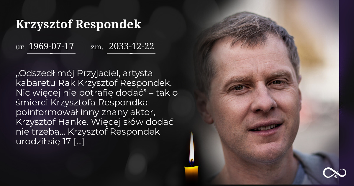 „Odszedł mój Przyjaciel, artysta kabaretu Rak Krzysztof Respondek. Nic więcej nie potrafię dodać” – tak o śmierci Krzysztofa Respondka poinformował inny znany aktor, Krzysztof Hanke. Więcej słów dodać nie trzeba… Krzysztof Respondek urodził się 17 lipca 1969 roku w Tarnowskich Górach. W tym mieście skończył II Liceum Ogólnokształcące im. Stanisława Staszica w Tarnowskich Górach, a następnie studiował na Wydziale Aktorskim Państwowej Wyższej Szkoły Teatralnej we Wrocławiu. Zaraz po studiach zaczął występować – przede wszystkim w musicalach – w Teatrze Rozrywki w Chorzowie. Pierwszego dnia stycznia 1999 roku dołączył do – założonego w 1981 roku w Rudzie Śląskiej – kabaretu Rak. Jednym z jego założycieli był właśnie Krzysztof Hanke. Członkiem kabaretu Rak Krzysztof Respondek był do swych ostatnich dni. Grał w wielu filmach i serialach. Najpopularniejszą była rola w serialu „Barwy szczęścia”. Wygrał także trzecią edycję emitowanego w telewizji Polsat programu „Jak oni śpiewają”. Nagrody za ten triumf przeznaczył na cele charytatywne. Zdobył m.in. Złoty Samowar, Złotą Maską, był również nominowany do Wiktora. – Aktor bez popularności jest jak ryba bez wody, jak żołnierz bez karabinu, jak niebo bez gwiazd. Czegoś zawsze brakuje. Megapopularność byłaby na pewno uciążliwa, ale ta, którą posiadam, jest w sam raz. Pozwala mi funkcjonować w tym zawodzie trochę jako aktor, trochę jako kabareciarz i trochę jako wokalista – mówił Krzysztof Respondek „Gazecie Wyborczej” w 2015 roku. Kilka dni przed śmiercią dostał zawału serca. Trafił do szpitala w Zabrzu. Lekarze trzy dni walczyli o życie Krzysztof Respondka. Niestety, nie udało się go uratować. Zmarł w wieku 54 lat.