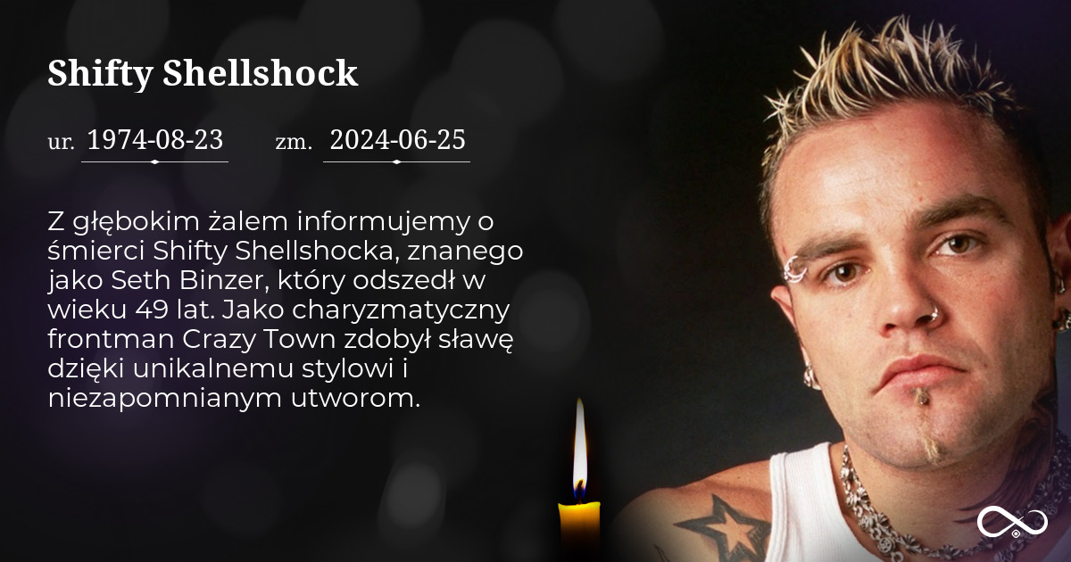 Shifty Shellshock: Życie pełne muzyki i wyzwań Seth Binzer, znany lepiej jako Shifty Shellshock, urodził się 23 sierpnia 1974 roku w Los Angeles. Wychowany w sercu kalifornijskiej sceny muzycznej, już od młodych lat wykazywał zainteresowanie muzyką. Jego miłość do rytmu i słowa szybko przekształciła się w karierę muzyczną, która z czasem zdobyła międzynarodowe uznanie. Shifty był współzałożycielem zespołu Crazy Town, który zyskał ogromną popularność na przełomie lat 90. i 2000. Debiutancki album zespołu, "The Gift of Game" (1999), przyniósł im ogromny sukces dzięki singlowi "Butterfly", który stał się globalnym hitem. Piosenka, łącząca elementy rocka i rapu, stała się symbolem ery nu-metalowej i do dziś pozostaje kultowym utworem. Życie Shifty'ego nie było jednak pozbawione trudności. Jego kariery muzycznej towarzyszyły liczne problemy osobiste, w tym walka z uzależnieniami. Shifty wielokrotnie otwarcie mówił o swoich zmaganiach, co uczyniło go symbolem nadziei dla wielu osób borykających się z podobnymi problemami. Jego publiczne zmagania z nałogiem były również dokumentowane w popularnym programie telewizyjnym "Celebrity Rehab with Dr. Drew". Pomimo licznych wyzwań, Shifty nigdy nie stracił pasji do muzyki. Kontynuował tworzenie i występowanie, a jego autentyczność i energia na scenie zjednywały mu rzesze fanów. Jego teksty, często refleksyjne i osobiste, odzwierciedlały jego życiowe doświadczenia i przemawiały do słuchaczy na całym świecie. Shifty Shellshock był nie tylko utalentowanym muzykiem, ale także osobą, która nie bała się stawić czoła swoim demonom. Jego życie, choć pełne wzlotów i upadków, pozostanie inspiracją dla wielu. Jego dziedzictwo muzyczne i walka o lepsze jutro będą pamiętane przez fanów i społeczność muzyczną na całym świecie. Zachęcamy do zapalenia wirtualnej świeczki i uczczenia pamięci Shifty Shellshocka na stronie Zapamiętani.pl. Razem możemy podtrzymywać jego pamięć i wspierać się nawzajem w trudnych chwilach.← powrót