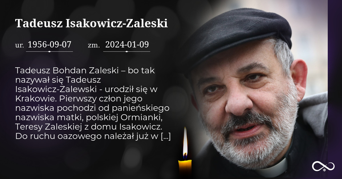 Tadeusz Bohdan Zaleski – bo tak nazywał się Tadeusz Isakowicz-Zalewski – urodził się w Krakowie. Pierwszy człon jego nazwiska pochodzi od panieńskiego nazwiska matki, polskiej Ormianki, Teresy Zaleskiej z domu Isakowicz. Do ruchu oazowego należał już w liceum, po skończeniu którego wstąpił do Wyższego Seminarium Duchownego w Krakowie. „Świecenia kapłańskie przyjął w 1983 r. z rąk kard. Franciszka Macharskiego. Przygotowywał się do nich w Wyższym Seminarium Duchownym Archidiecezji Krakowskiej z dwuletnią przerwą, gdyż zaraz po wstąpieniu do seminarium w 1975 r., został wcielony do wojska. Pobór alumnów do zasadniczej służby był represją ze strony władz wymierzoną w Kościół katolicki i jego niepokornych hierarchów. Alumn Tadeusz trafił do jednostki w Brzegu. Pobyt utwierdził go w przekonaniu o słuszności opozycyjnych działań podejmowanych wobec władz komunistycznych” – wspomina Instytut Pamięci Narodowej. Dlatego w czasach PRL-u był inwigilowany i represjonowany przez SB jako kapłan i kapelan „Solidarności” w Nowej Hucie. To właśnie na podstawie tamtych wydarzeń Maciej Gawlikowski zrobił w 2006 roku film „Zastraszyć księdza”. „Ks. Isakowicz-Zaleski był uważany za nieformalnego lidera środowiska dawnych mieszkańców Kresów Wschodnich II RP. Szczególnie tej części, która uważa, że państwo za mało dba o pamięć ofiar rzezi wołyńskiej. W 2008 r. wystąpił z apelem o potępienie przez władze polskie „ludobójstwa Polaków przez OUN-UPA na Wołyniu i w Małopolsce Wschodniej w 1943 r”. W kolejnych latach podobne akcje duchowny inicjował przed ukraińskimi placówkami dyplomatycznymi” – podkreśla Małgorzata Skowrońska w portalu Wyborcza.pl Kraków. W 2006 r. prezydent RP Lech Kaczyński odznaczył ks. Tadeusz Isakowicza-Zaleskiego za działalność opozycyjną Krzyżem Komandorskim Orderu Odrodzenia Polski. Siedem lat wcześniej otrzymał Krzyż Kawalerski Orderu Odrodzenia Polski, a w 2016 r. – Krzyż Wolności i Solidarności. IPN przyznał także nagrodę Kustosza Pamięci Narodowej za zasługi w upamiętnianiu historii narodu polskiego. W ostatnim czasie ks. Tadeusz Isakowicz-Zaleski walczył z nowotworem. Zmarł nad ranem 9 stycznia 2024 r. w szpitalu w Chrzanowie, do którego trafił pod koniec 2023 roku. Miał 67 lat. „Z głębokim żalem przyjęliśmy wiadomość o śmierci Księdza Tadeusza Isakowicza-Zaleskiego, którego życie było wyjątkowym przykładem poświęcenia, ciepła i skromności. Jego odejście stanowi ogromną stratę nie tylko dla osób z niepełnosprawnością, którym służył z niezachwianym oddaniem, ale także dla całej społeczności Fundacji im. Brata Alberta, którą inspirował swoją pracą i osobowością” – napisała w mediach społecznościowych Fundacja im. Brata Alberta.