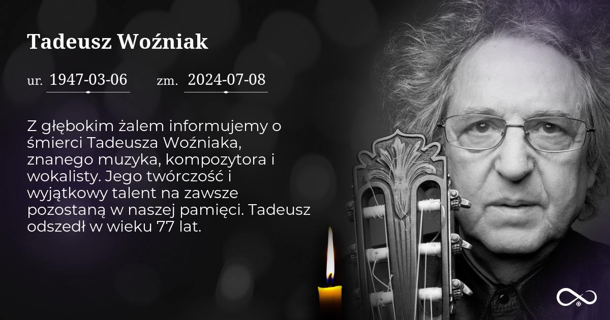 Z głębokim żalem informujemy o śmierci Tadeusza Woźniaka, znanego muzyka, kompozytora i wokalisty. Jego twórczość i wyjątkowy talent na zawsze pozostaną w naszej pamięci. Tadeusz odszedł w wieku 77 lat.